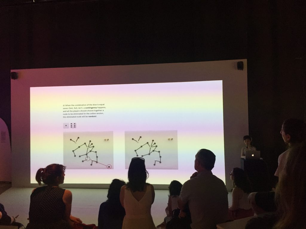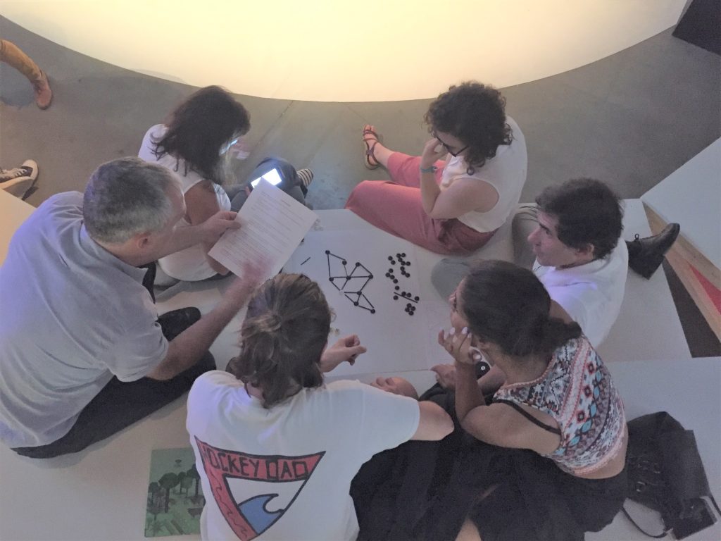 El proyecto Juego de enjambres de Paula Nishijima se desarrolló a lo largo de 2019 a través de una serie de sesiones de trabajo con agentes de distintos centros de investigación, talleres abiertos al público y sesiones de testeo del juego en el Máster en Organización de Sistemas de la Universidad Politécnica de Madrid.